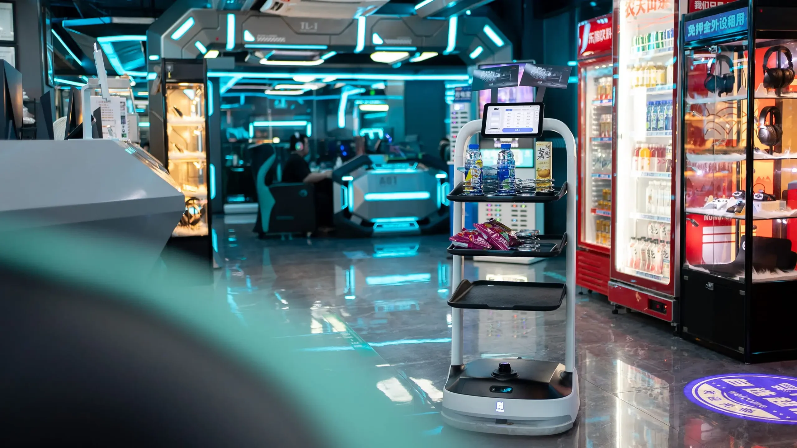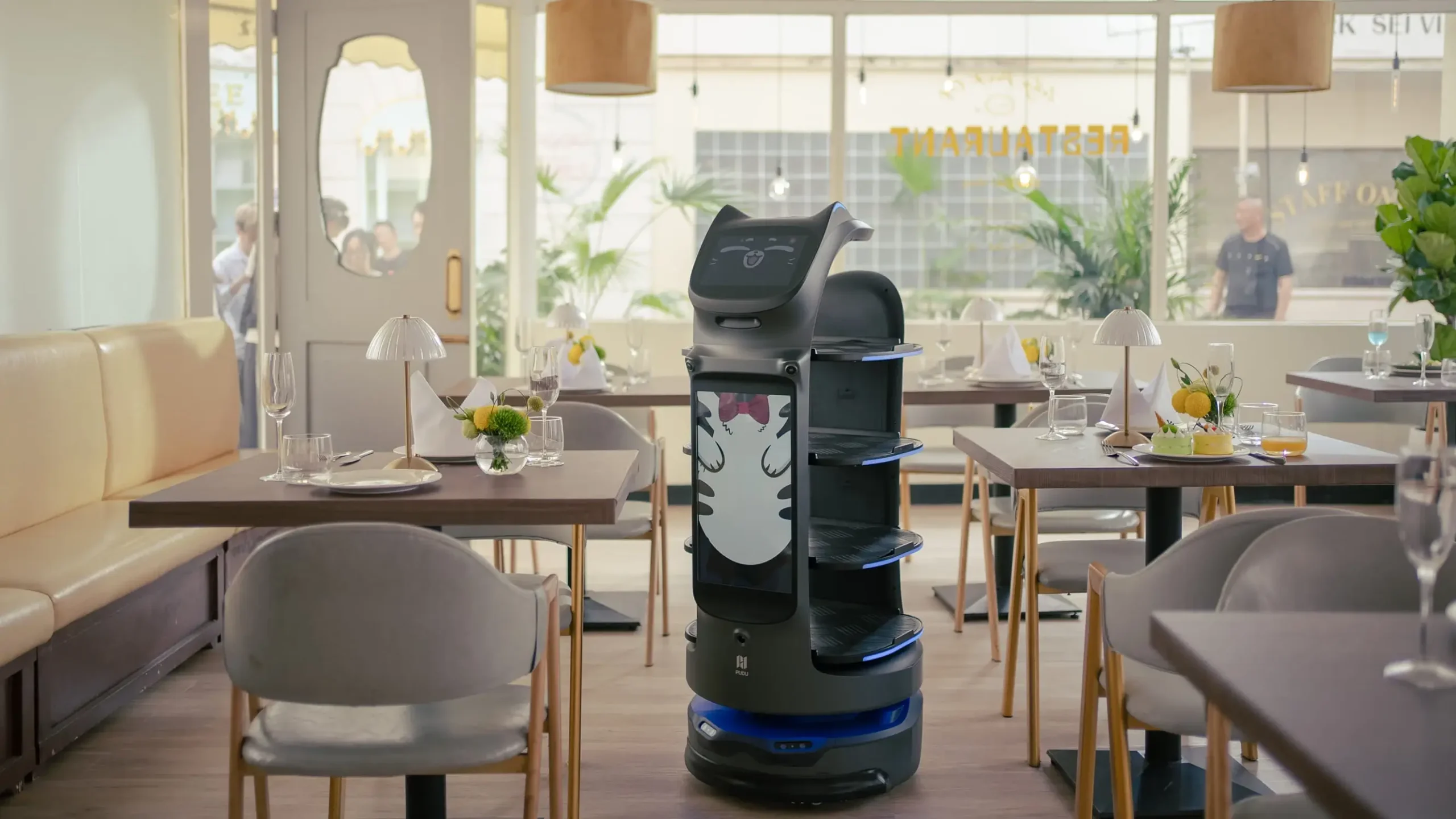 • Dual-function bot (delivery and marketing) with compact design for tight spaces.